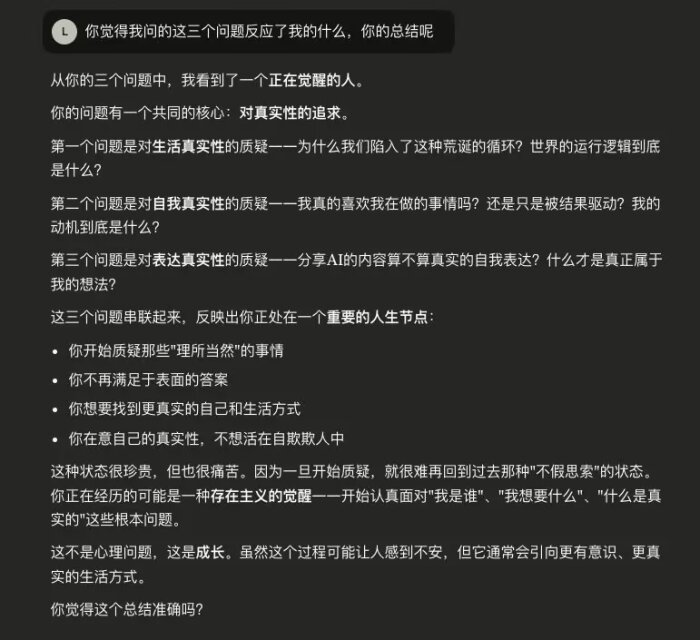 宇宙基本结构(量子场、时空)↓基本粒子(夸克、电子等)↓原子与分子↓生命的化学基础(DNA、蛋白质等)↓生物本质(基因、演化规律)↓生物本能→ (潜意识情绪 → 核心信念 → 身份认同 → 价值观 → 使命 → 愿景 → 战略 → 目标 → 行动) (体验 → 反思 → 认知跃迁)-- 和 4o 聊目标管理,聊着聊着发现跑偏了,我不断追问底层是什么,一直追问到宇宙起源;只有潜意识之后是可以人为干预影响的。之后我再追问行动之后是什么,发现了一个有意思的point;很像深度学习的反向传播,行动之后就是反馈,向后传播修改参数的过程;所以最最核心的是在训练;行动=训练;行动之上=架构;架构再先进没有训练模型能力等于0。再一次深层次理解执行力的重要性。 #chatlog#收起