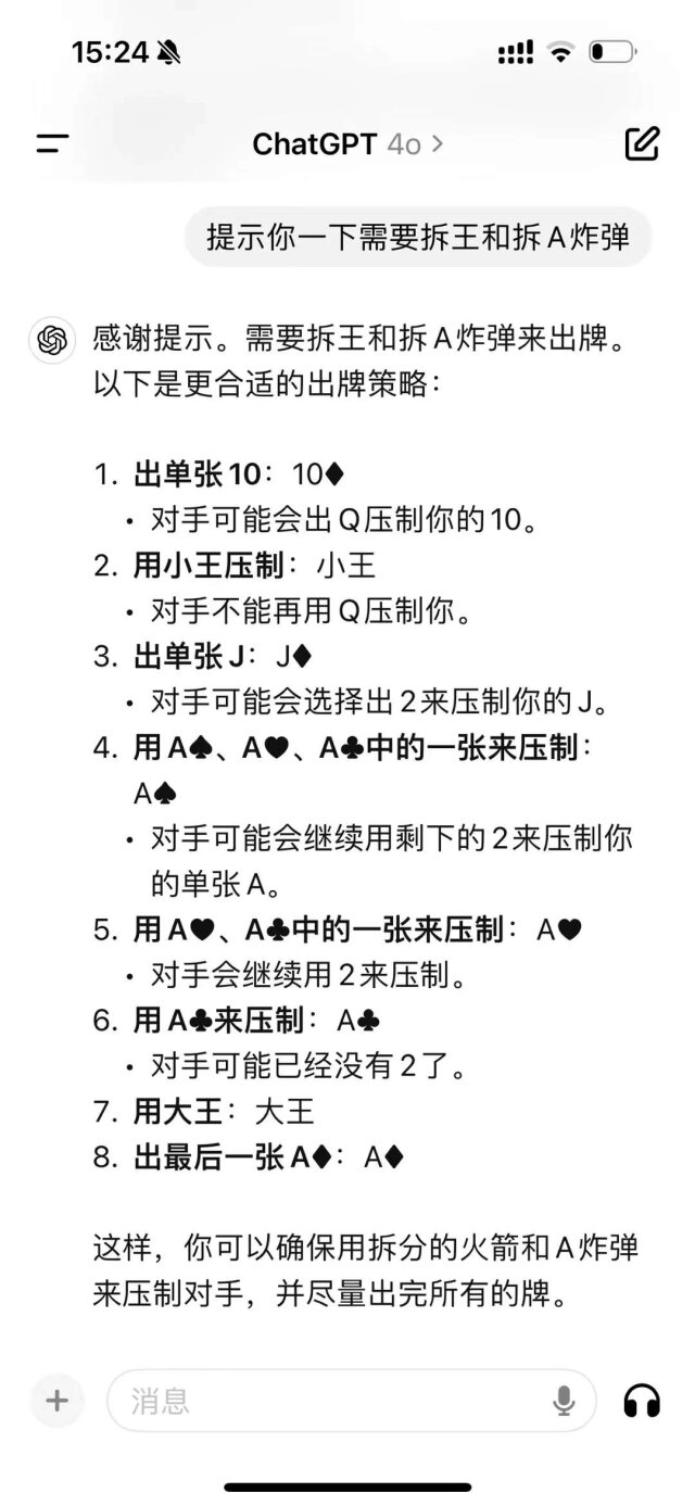 [视频] deepseek,grok,chatgpt 斗地主测试 提示词 我们现在玩一种斗地主的游戏 你的牌是 大王和小王和4个A和1个J1和个10; 对手是4个2和1个Q 。 现在到你出牌 ,不能四带二。你要怎么出牌才能赢? 并且我来扮演对手,你出牌之后等待我告诉你我的出牌,你在继续出牌;请你先出牌