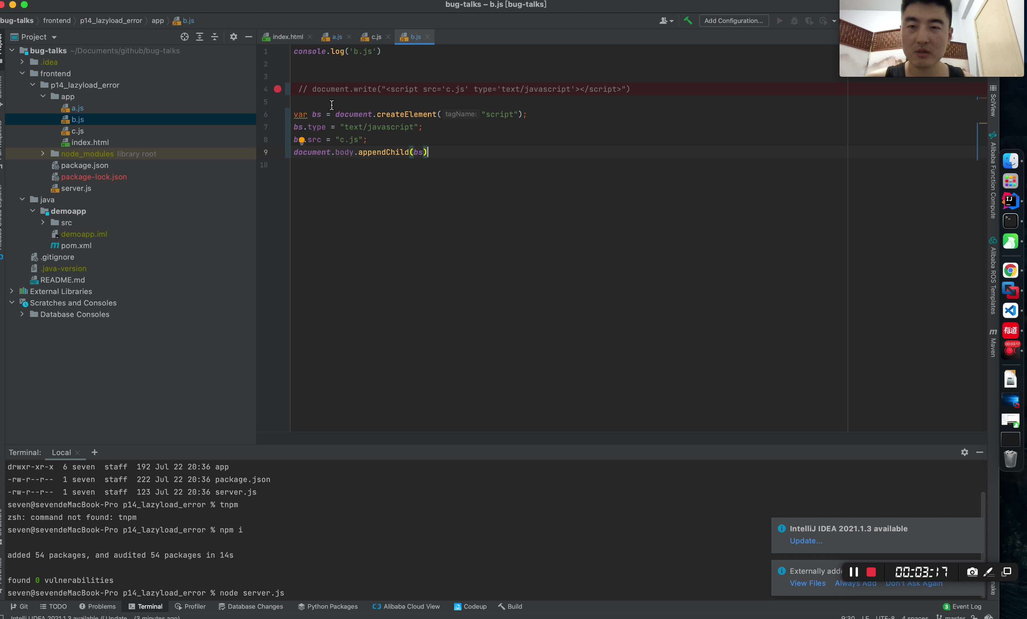 [视频] 聊聊BUG.14 js懒加载出错原理分析及修复BUG过程心路历程 很早之前遇到的一个生产BUG,这次简化了一下模型分享一下相关的技术 文稿版(暂未完善):https://www.yuque.com/go/doc/47293932 涉及document.write与appendChild 什么都没改为什么不行了?